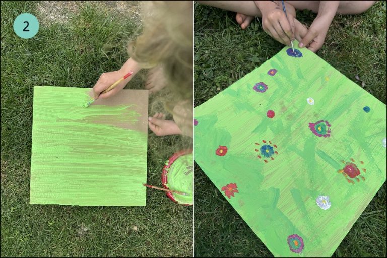 2.) Medtem ko se tulci sušijo, pobarvamo kartonasto podlogo. Vesna je z mamico ustvarila travnik s pisanim cvetjem.