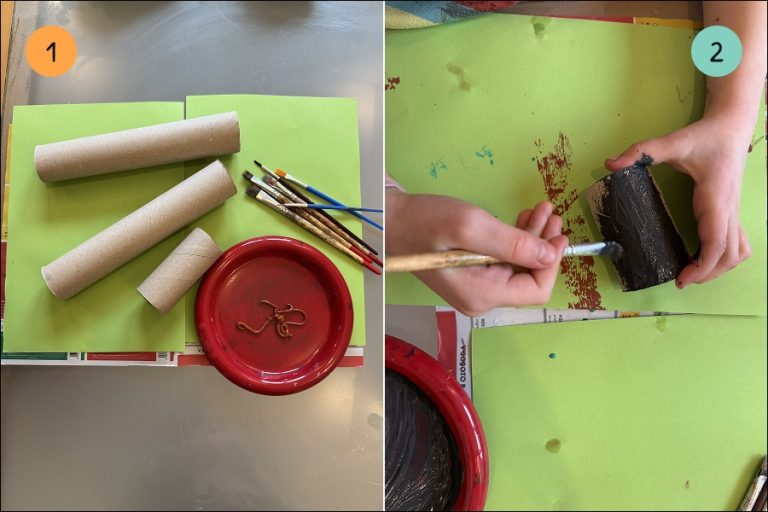 2.) S čopičem pobarvaj tulce vsakega s svojo barvo. Rjavo za Meda, roza za Pujsija, zeleno smo uporabili za najino prijateljico želvo Marušo in sivo za Staro Miš. No, sive nismo imeli, zato smo zmešali belo in črno.
