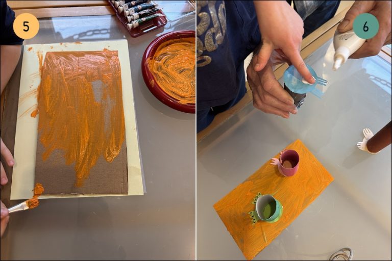 5.) Večji del kartona, ki bo služil kot podlaga, pobarvaj s svojo najljubšo barvo. Mi trije smo uporabili oranžno, ker je oranžna Pujsijeva najljubša barva. Morda pa je njegova najljubša barva rdeča ali zelena.