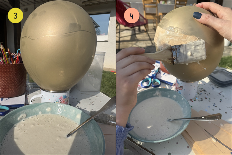 5.) Naredi trdno lupino: balon polepi približno do polovice. Priporočava ti, da narediš dve plasti papirja. Tako bo gnezdo dovolj trdno. Če želiš, ga lahko pobarvaš še zdaj.